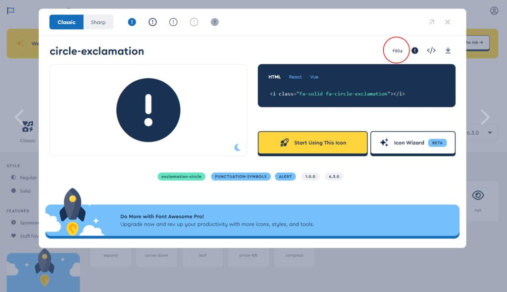 例)content: “\f06a”;